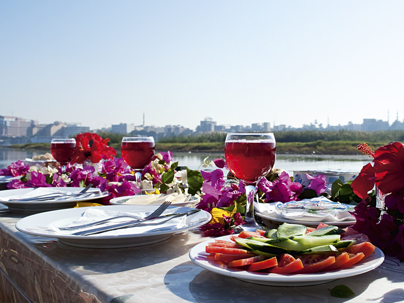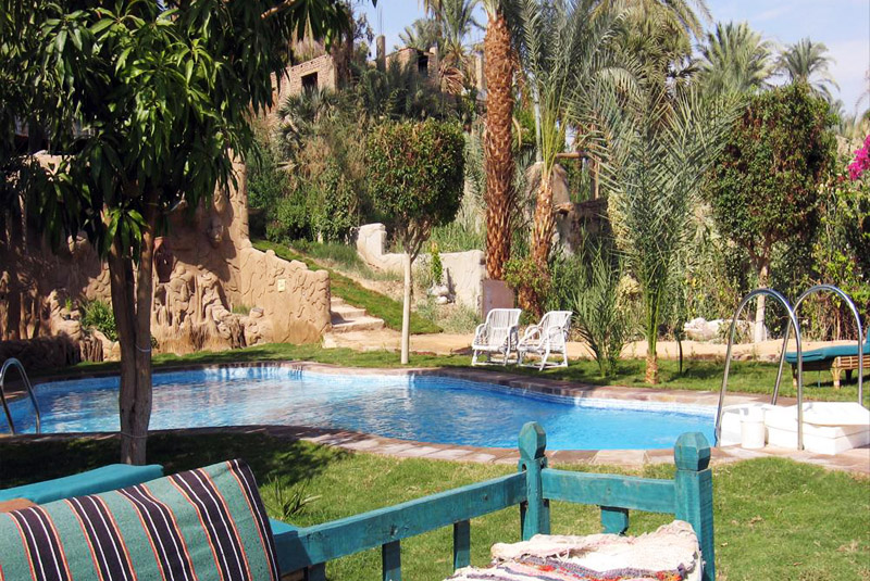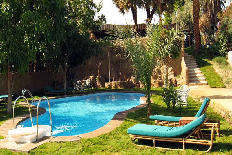 On the banks of the Nile Hotel Al Baeirat is situated within a banana plantation. Like a little village it blends into the neighbourhood and is built of country-specific architecture with domed structure which is traditionally made of clay. Off the beaten track you can enjoy the silence and the egyptian style in a private and friendly atmosphere. For relaxation we are offering the whole family a wonderful swimming pool directly on the banks of the Nile. From our patio which is overlooking the Nile we are serving egyptian titbits. While sipping your coffee or drinking a cool beer you can let your eyes wander to the town of Luxor on the opposite shore and at night watch the bright lights of the incoming cruise liners. In the neighbourhood you will find numerous temple complexes, the Valley of the Kings and many more sights.